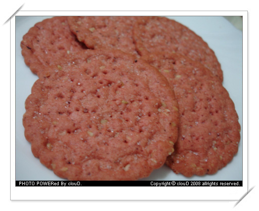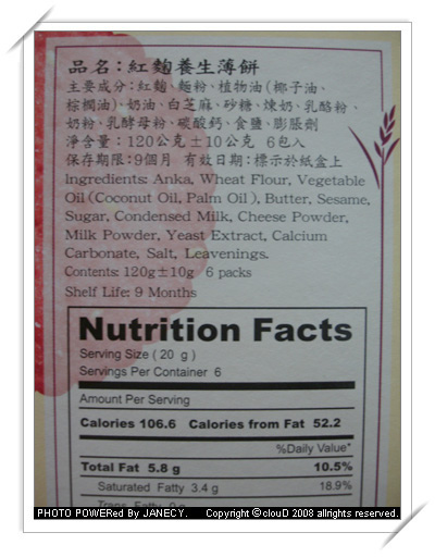 雖然我覺得加在餅乾裡的紅麴量應該不多,不過積少成多啊,一般餅乾大部份不是讓人變胖,就是讓人營養不良,至少這樣產品還算『良心』等級,加上平時就嘴饞,三不五時就會想拿紅麴餅乾來吃。餅乾有灑一些糖,吃起來就沒什麼紅麴的味道(聽說有人會怕紅麴味),連我家的阿肥都愛吃的不得了。