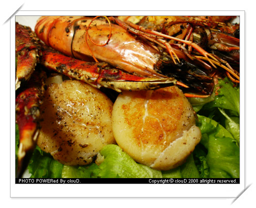 小龍蝦,應該是蝦菇吧,肉雖然沒有很多,但是吃起來也挺不賴的。還有忘了是什魚(我對不起你,吃完就忘了=_=),沾點檸檬,海的鮮味充滿嘴呀。