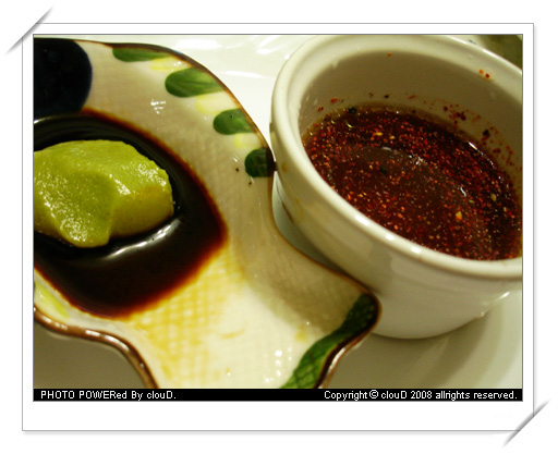 吃海鮮一定要弄個哇沙米,這次再多調了一小碗和風酸辣醬(家樂福有賣和風醬)再灑上七味粉,兩種不同口味的醬料,都會讓胃口大開=_=