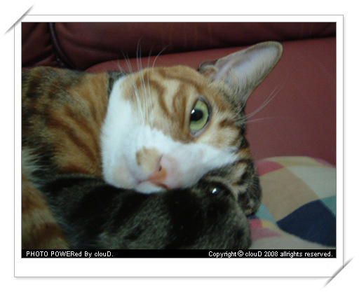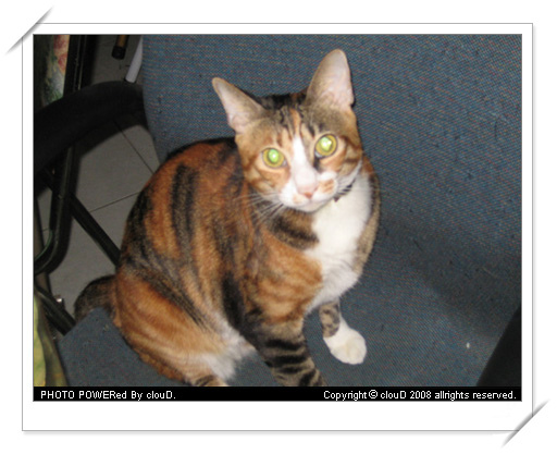 非常喜歡抓椅子,整張辦公椅都快被牠抓爛了,特愛咬塑膠袋不愛吃化毛膏洗澡總是哀號聲很大,三不五時就要送醫院。愛撒嬌卻不給人抱,膽小怕事的傢伙。